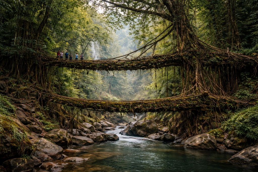 The Living Root Bridges are one of the most extraordinary examples of human–nature collaboration. Unlike regular bridges made of concrete or wood, these bridges are formed from the aerial roots of rubber fig trees.